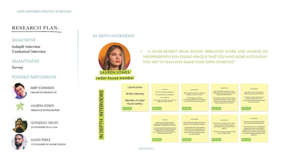 Interviews conducted across several areas of interest from individual who engaged in the system of interest, from studio members and freelancers to gallery curators. A total of 4 interviews, each lasting from 30 to 60 minutes. Participants were asked questions regarding the established systems, pain points of experiences and overall navigation within the arts and design community.
